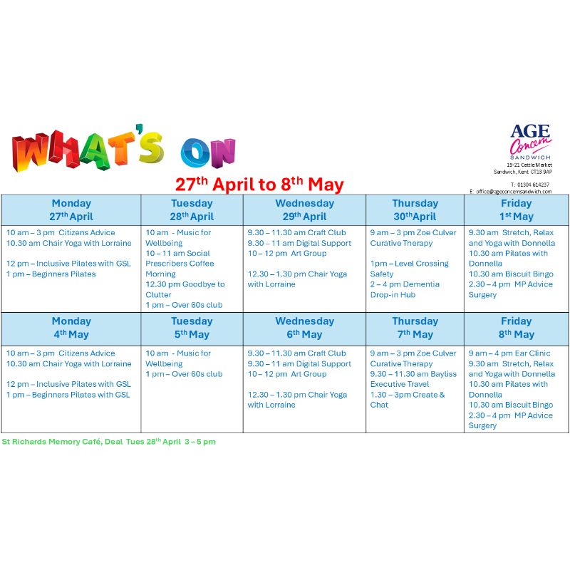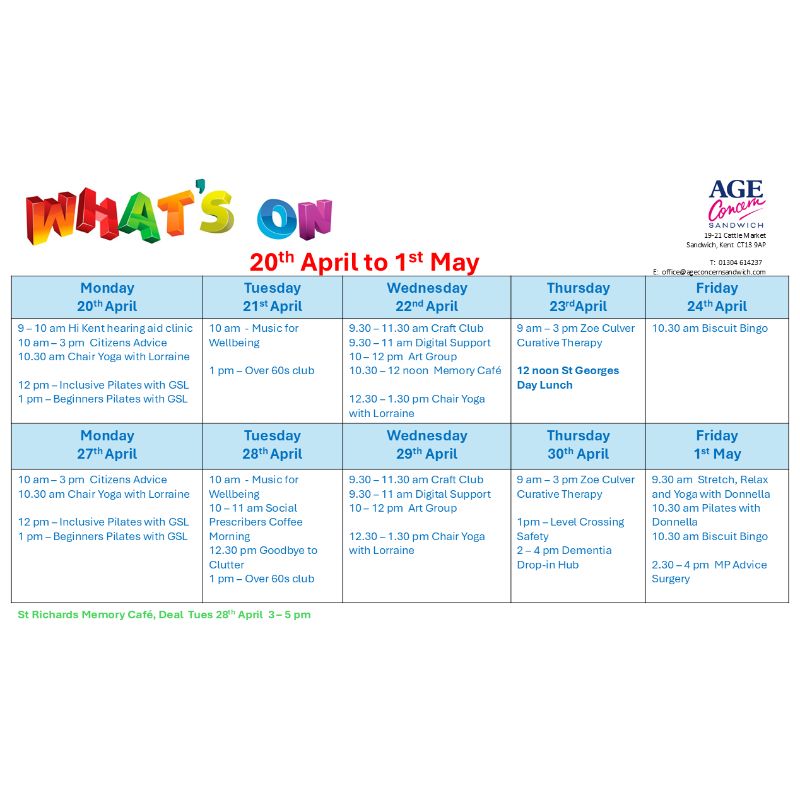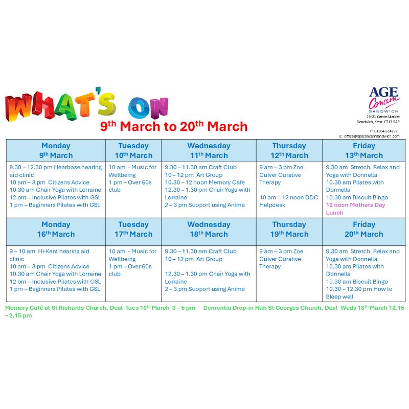 Age Concern Sandwich provides a caring and friendly environment where people can meet up and join in with the many services and events we offer.
