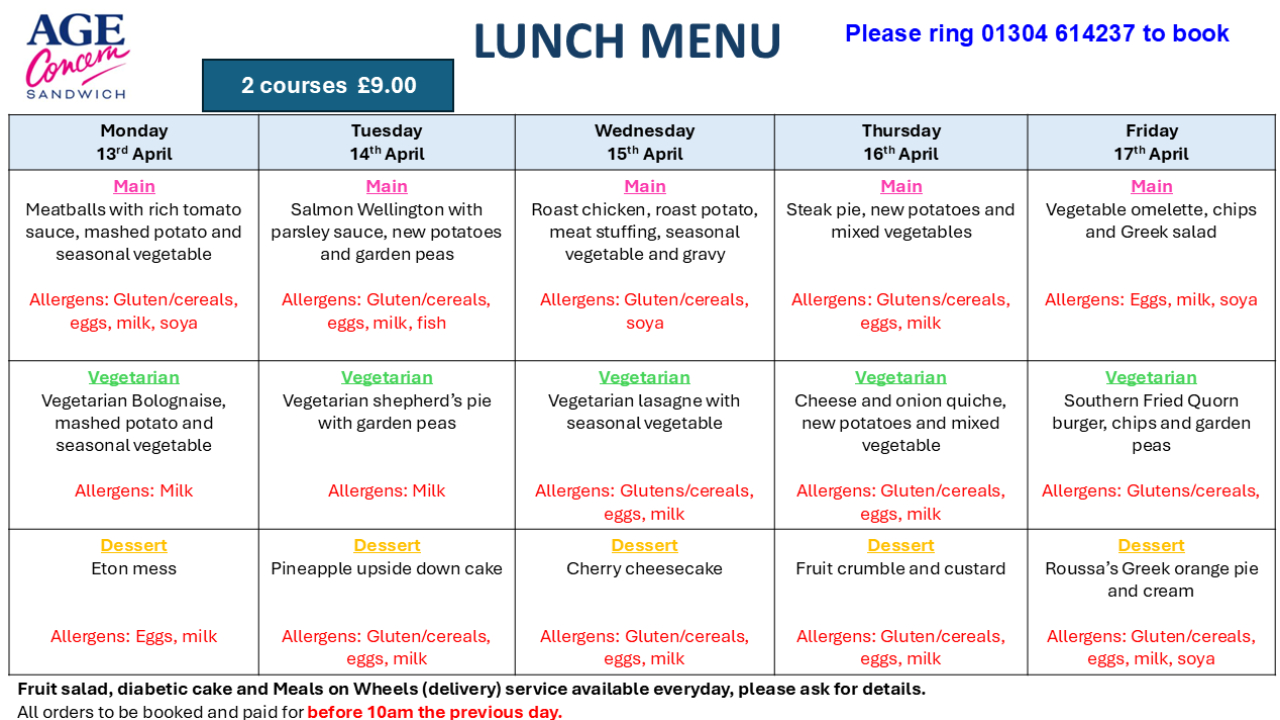 Our tempting selection of snacks, lunches and light bites perfectly complements the Centre’s delicious daily 2-course hot lunch, as well as our Meals on Wheels service, delivering freshly prepared meals to clients across the local area.